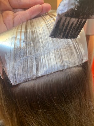 Mit feinen Abteilungen und sorgfältiger Falttechnik setzt sie über 100 Folien liebevoll bis an die Kopfhaut. Bei der Chicagolights Technik haben wir auch nochmal die Kontrolle ob Blondierung oder Farbe aus den Folien entwichen ist.