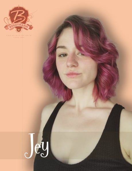 Bunt, bunter, Jey! Ja, unsere Jey hat eine große Vorliebe für bunte und auffällige Farben. Man darf immer wieder gespannt sein, welche neuen Techniken und Farben sie auch gerne an ihrem eigenen Kopf austestet. Jey ist sehr perfektionistisch und setzt sich gerne große Ziele. Sie ist immer wissensdurstig und ist gerne bereit, auch mal ins kalte Wasser zu springen.